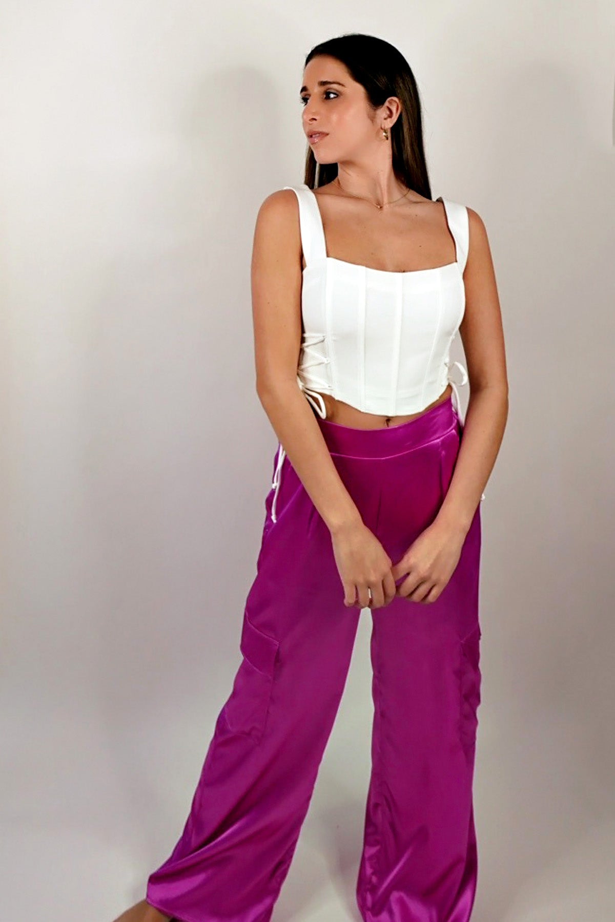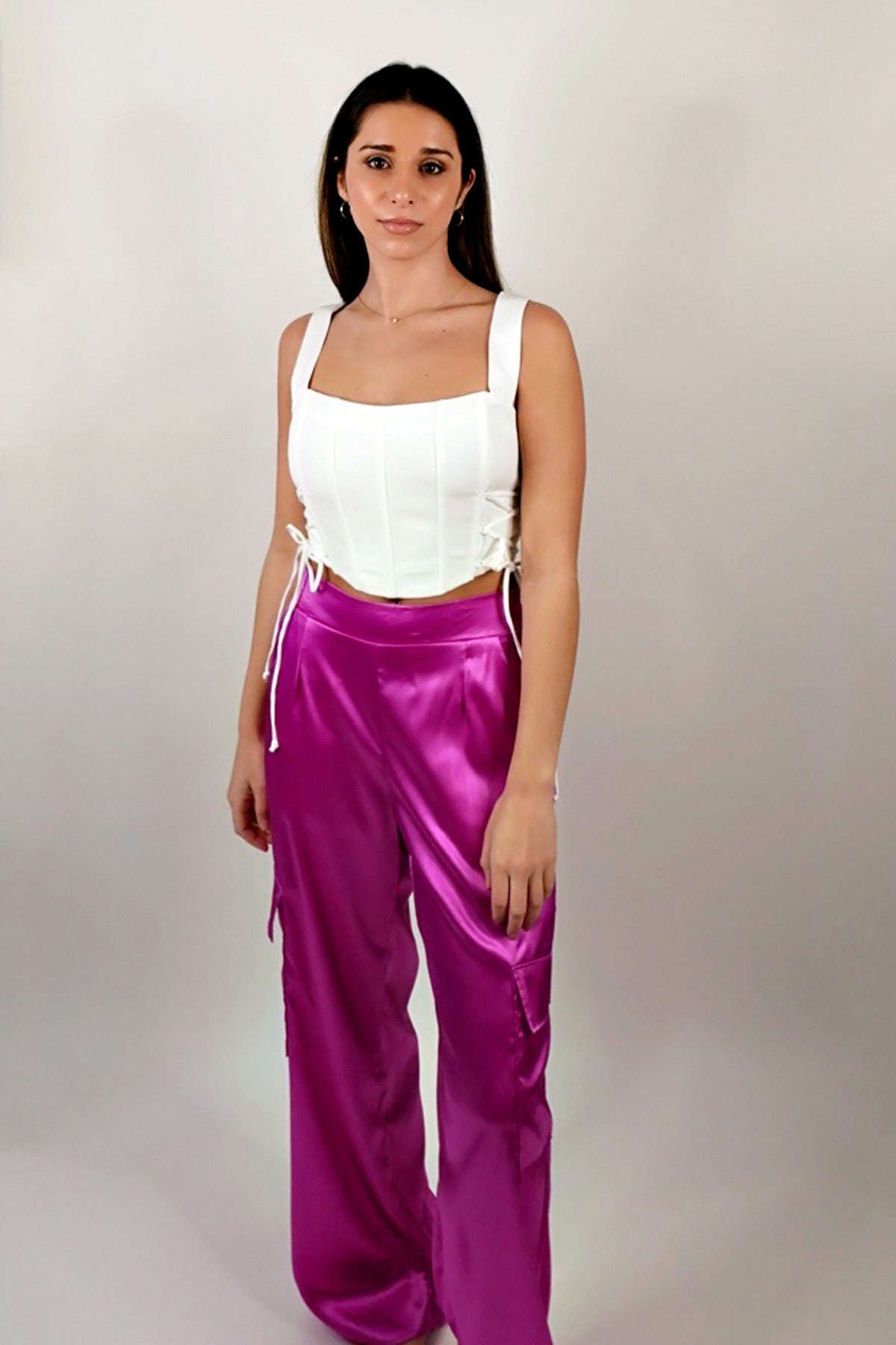 Cropped corset top with lace up sides and zip back. Available in lavender and white. Fits true to size. See other listings for Kellie satin pants and lavender Anna corset.