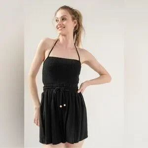 Black halter neck romper with elastic band open back, drawstring waist, and smocked detail. Fits true to size.