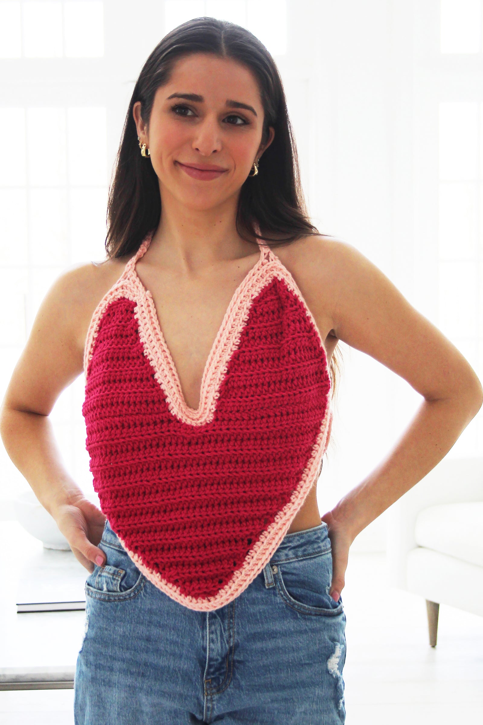 One of a kind hand crocheted halter top. Super soft yarn featuring an adorable heart shape. Will fit sizes extra small - medium best. Top is 18" long depending on how you tie it. Due to the delicate nature of the materials please hand wash and lay flat to dry. Only available from Peach Sky Boutique.