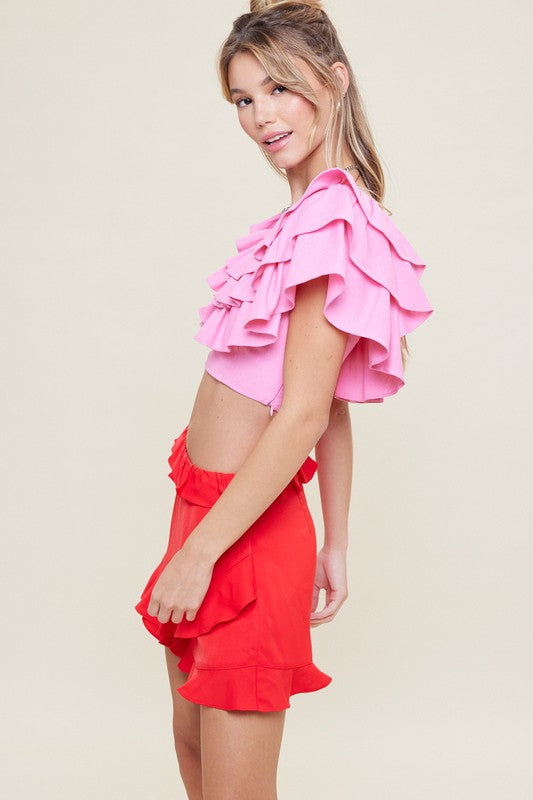 Pink v-neck ruffle crop top. Fits true to size.