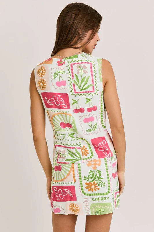 Island print button down sleeveless top and mini skirt with slit. Fits true to size.