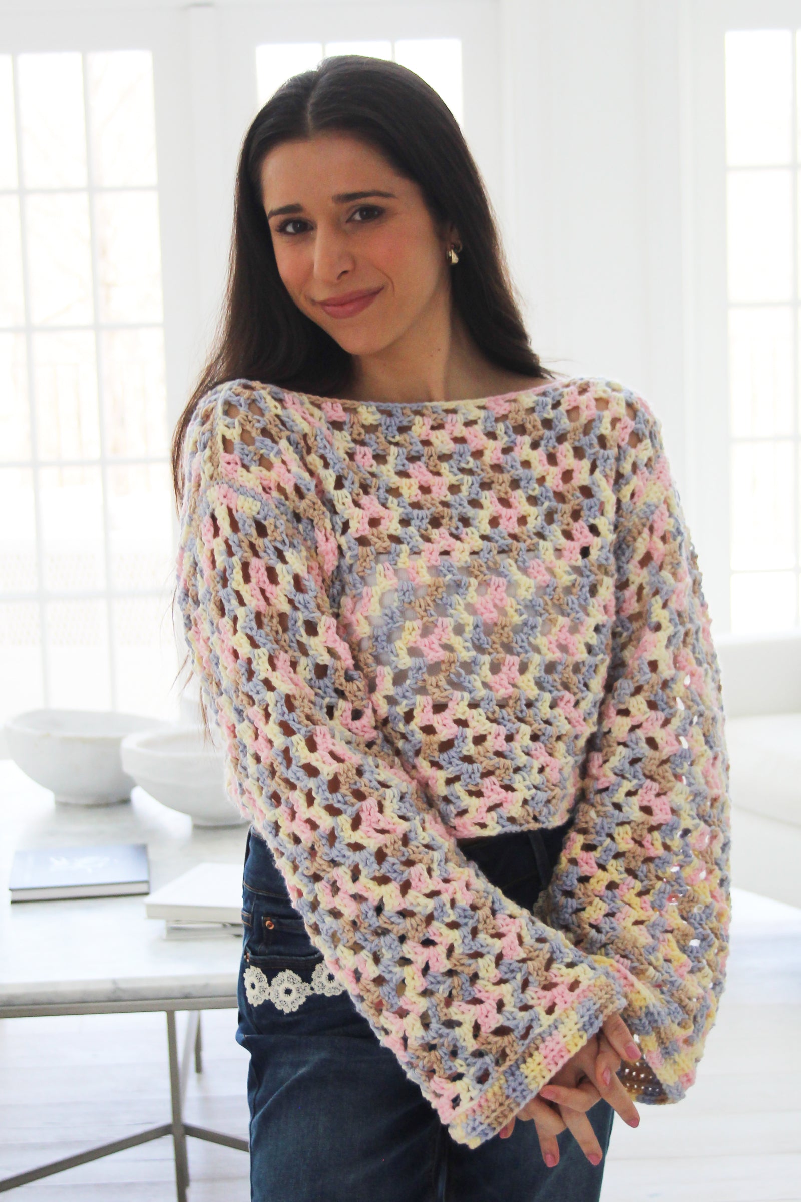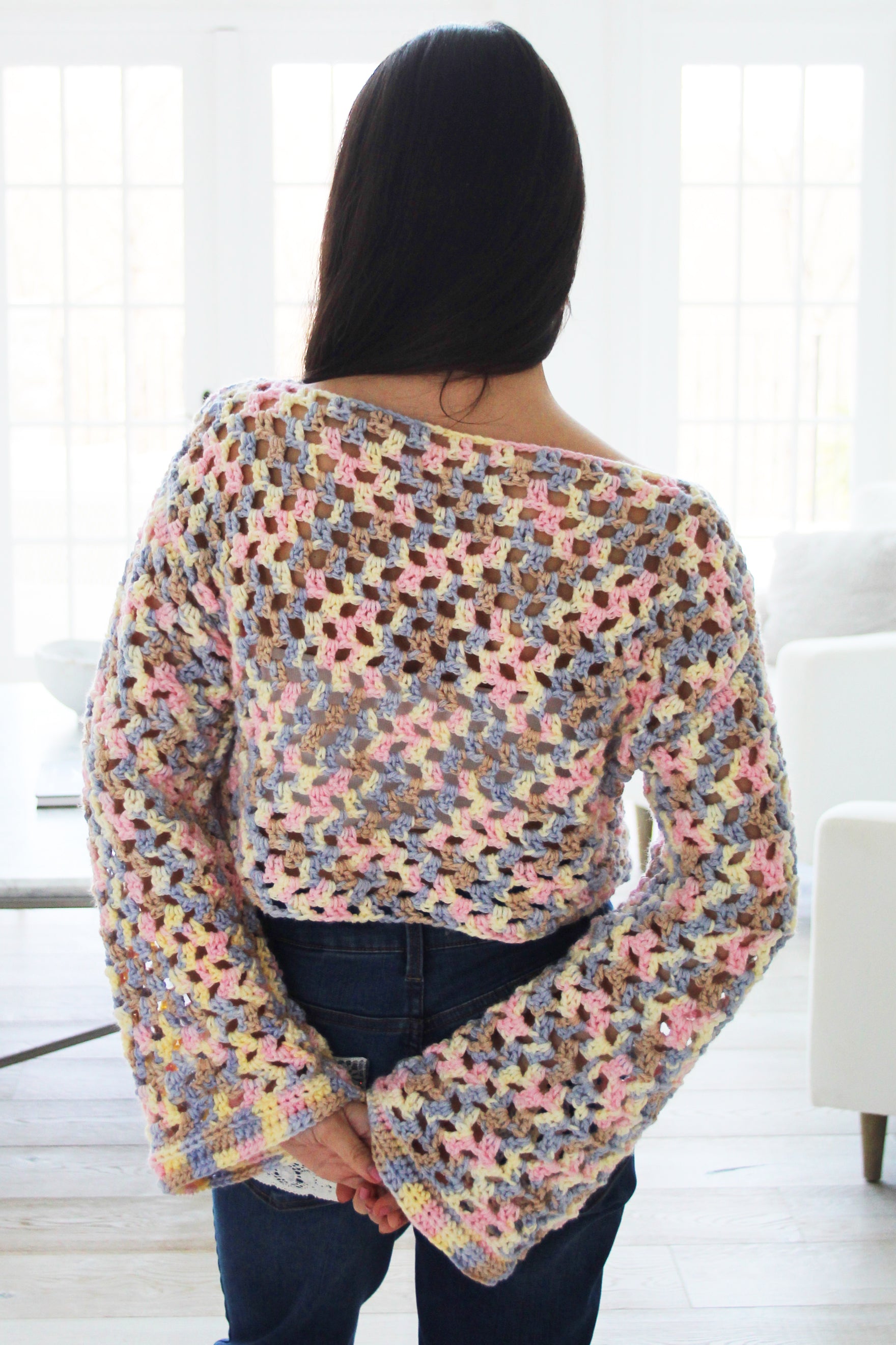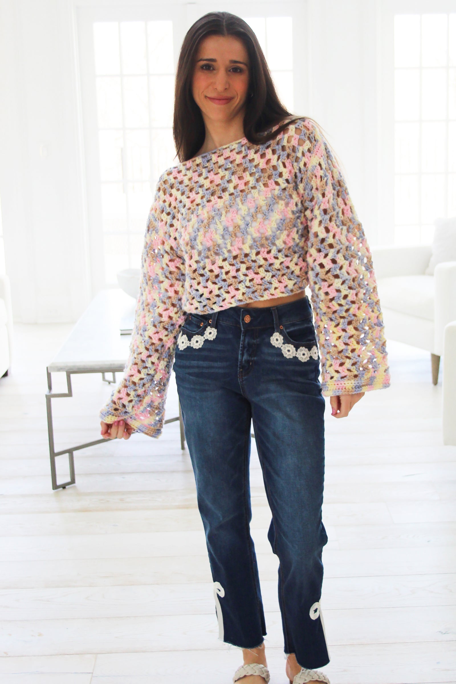 One of a kind hand crocheted long sleeve sweater. Super soft yarn featuring an open weave. Model is wearing a bandeau underneath. Slightly cropped. Will fit sizes extra small - small best. Top is 15" from top of shoulder to hem, chest is 36" around. Due to the delicate nature of the materials please hand wash and lay flat to dry. Only available from Peach Sky Boutique.