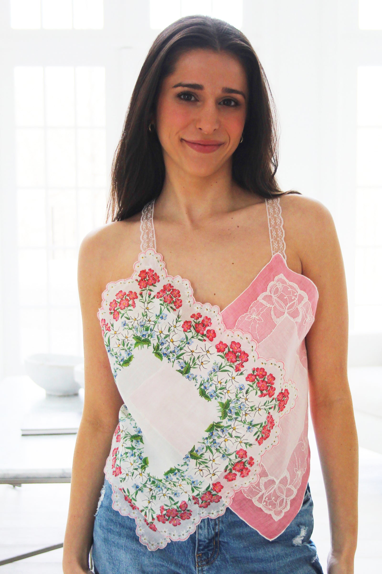 One of a kind top made from upcycled vintage handkerchiefs. Adjustable lace straps. Will fits sizes extra small - medium best. Due to the delicate nature of the materials please hand wash and lay flat to dry. Only available from Peach Sky Boutique.