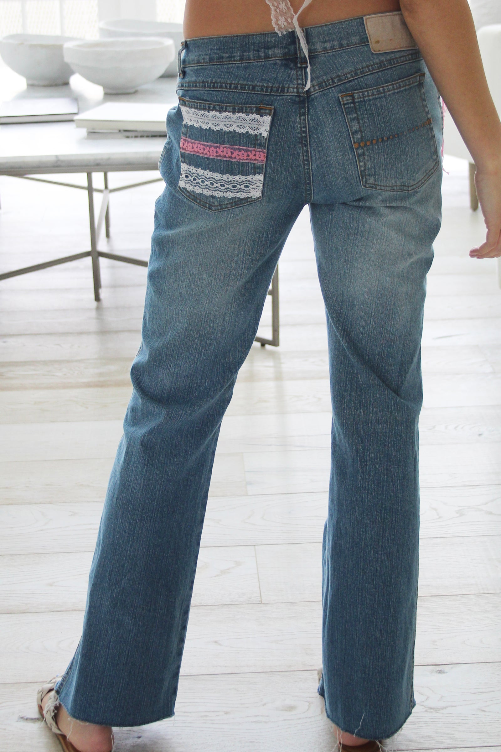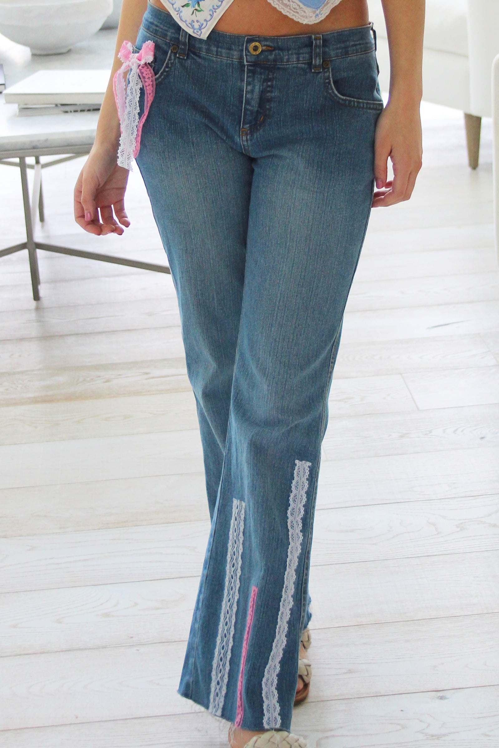 One of a kind upcycled lace jeans. Slightly Cropped, frayed and adorned with pink and white lace trims. Stretchy size 4 jeans. Mid rise with a 29" inseam. Due to the delicate nature of the materials please hand wash and lay flat to dry. Only available from Peach Sky Boutique.